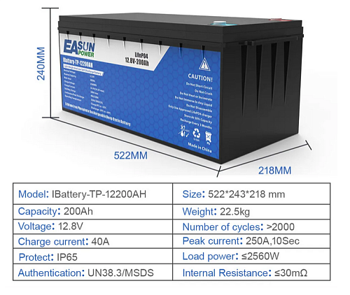 Основные параметры и характеристики аккумулятора EASUN POWER LiFePo4 12V 200Ah BMS IBattery-TP-12200AH