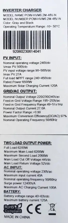 | Модель инвертора: | POW-HVM6.2M-48V-N |