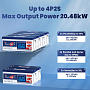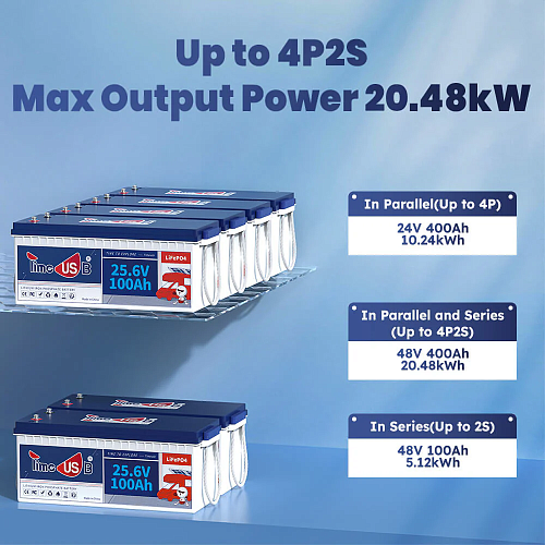Модель поддерживает гибкое масштабирование системы: допускается последовательное соединение до 2 аккумуляторов, параллельное — до 4 единиц, а также комбинированная схема 4P2S с общим количеством до 8 батарей. Встроенная система управления BMS на 100 А обеспечивает комплексную защиту от перезаряда, глубокого разряда, перегрузки по току, короткого замыкания и перегрева, повышая безопасность эксплуатации и надёжность всей системы.